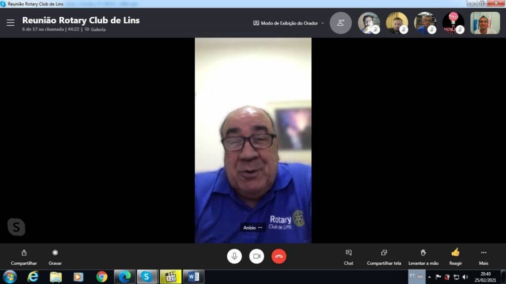 Na noite do dia 25 de Fevereiro de 2021, o Rotary Club de Lins comemorou o aniversário de 116 anos do Rotary International. Uma reunião especial presidida pelo companheiro Presidente Carlos Eduardo Teodoro. Na oportunidade foram debatidos os projetos em andamento, em especial o Ryla: Juventude & Oportunidades "O Futuro é agora" que abrirá oportunidades para jovens da comunidade local. A noite foi brindada com o depoimento do companheiro Anízio, falando um pouco sobre sua trajetória em Rotary e dividindo com os participantes todo seu conhecimento dos mais de 30 anos de sua vida rotária.