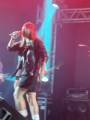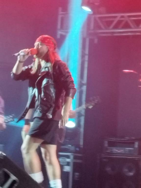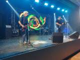 Foto posicionada da esquerda para a direita trás a imagem de um palco de show com três músicos; onde dois tocam seus instrumentos de corda e cantam de frente para microfones em pedestais e o outro está tocando bateria ao fundo. Na cena observamos muita iluminação de foco, caixas de som atrás e na frente e no fundo um grande painel trás imagens de vários círculos coloridos.