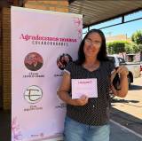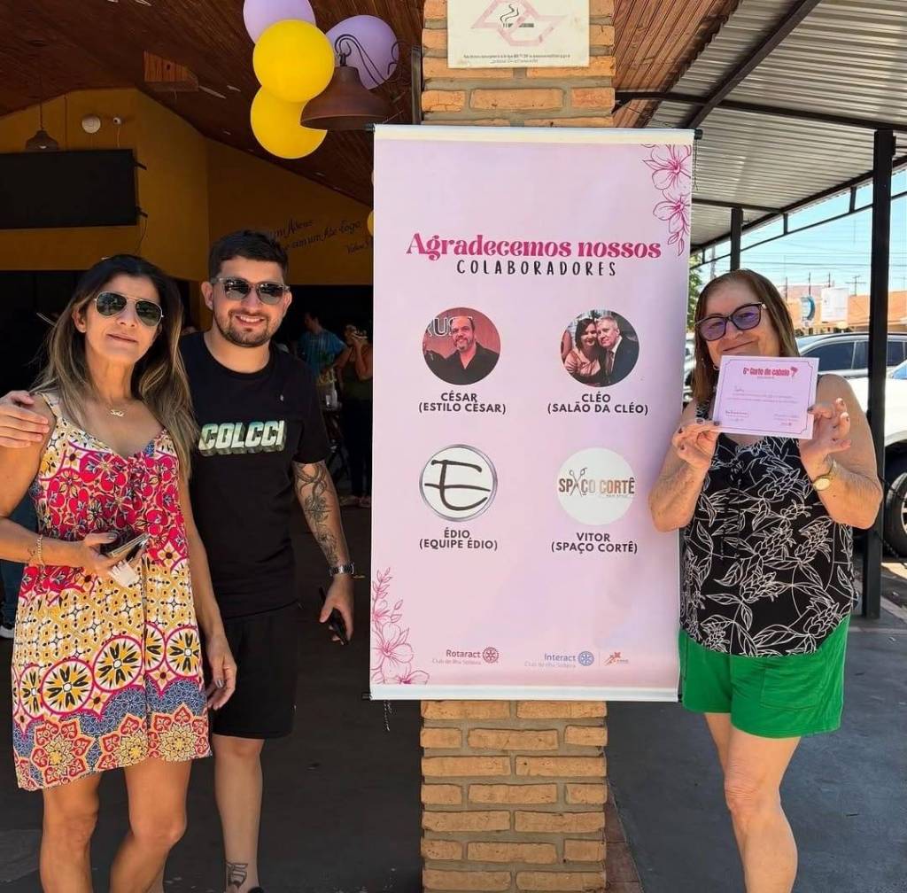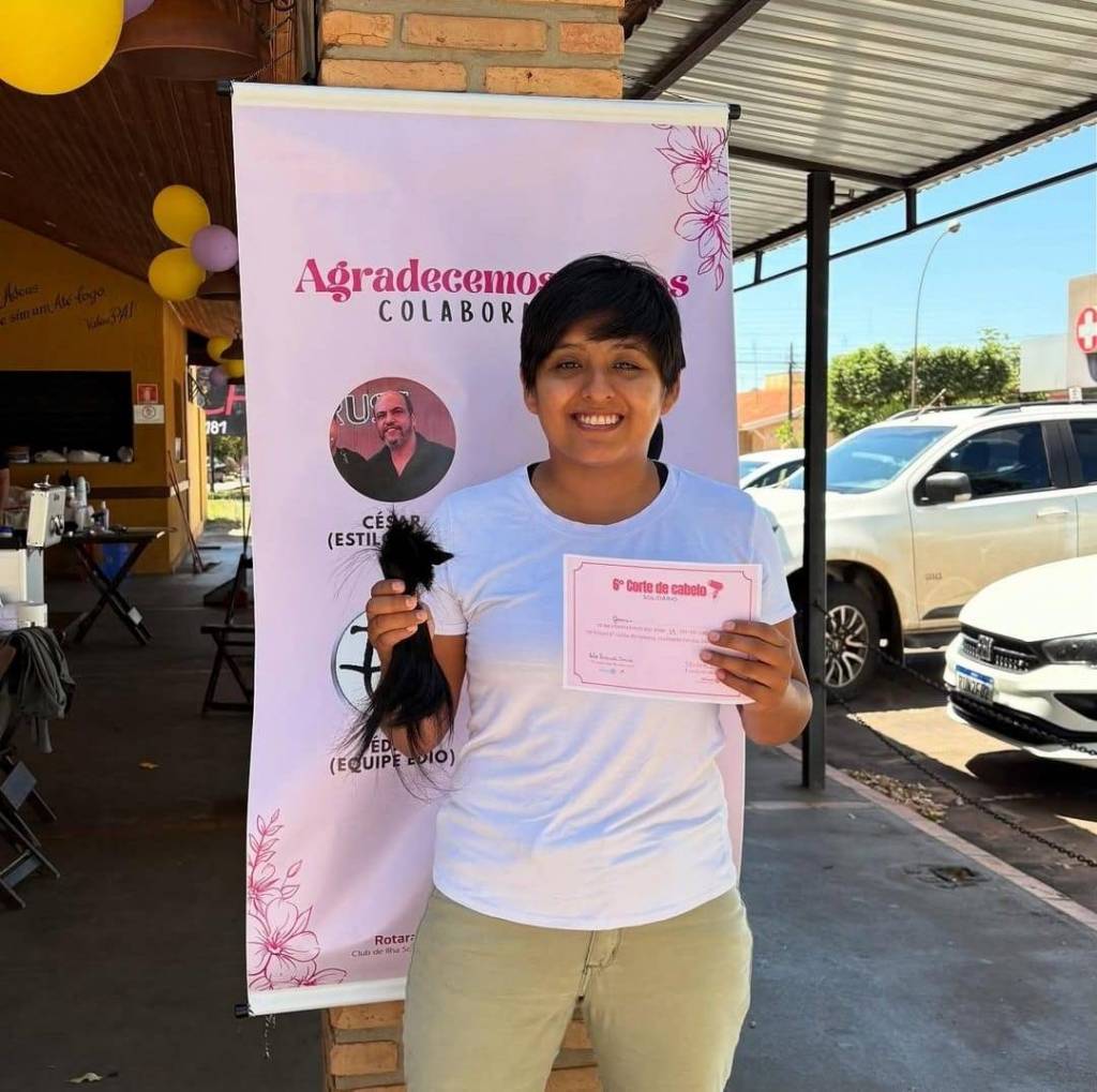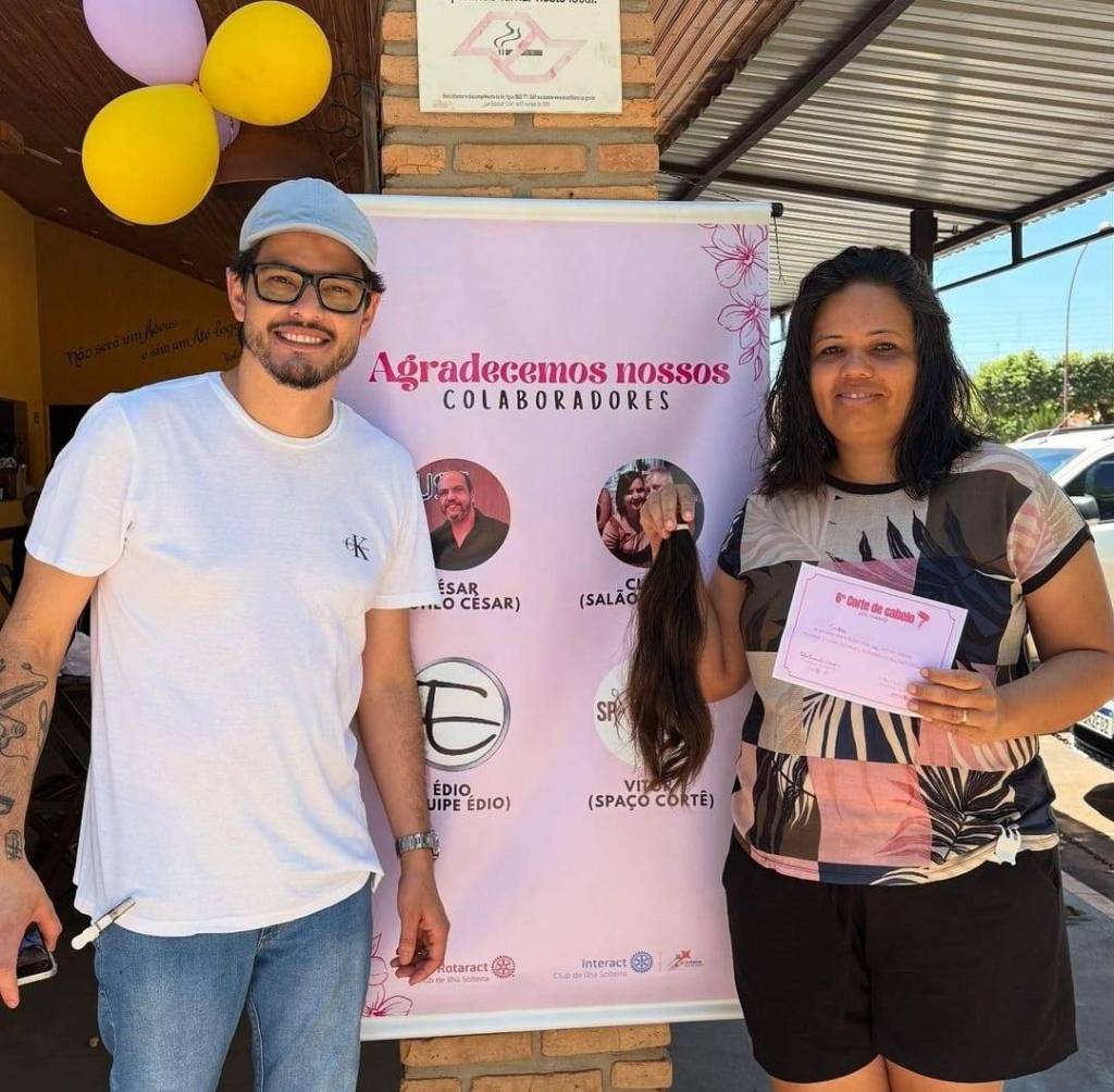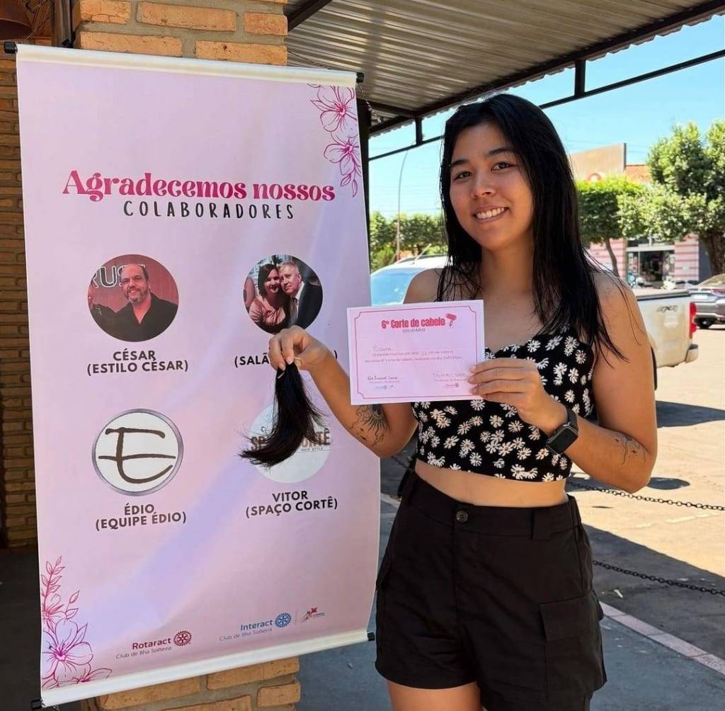 A imagem parece ter sido tirada em um evento, possivelmente relacionado a uma doação de cabelo ou atividade de caridade organizada pelo Interact Club de Ilha Solteira. O certificado segurado pela pessoa no meio sugere que isso pode ser um certificado de reconhecimento ou de participação pela doação de cabelo.