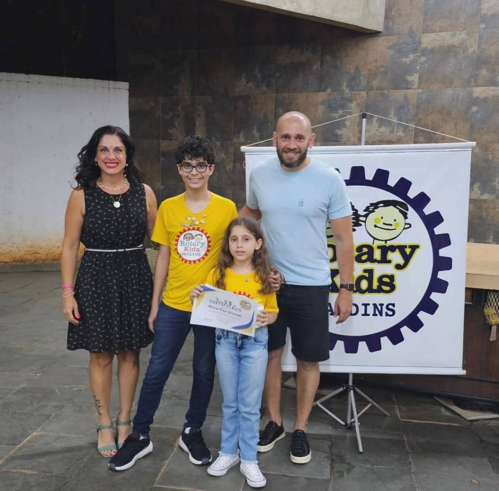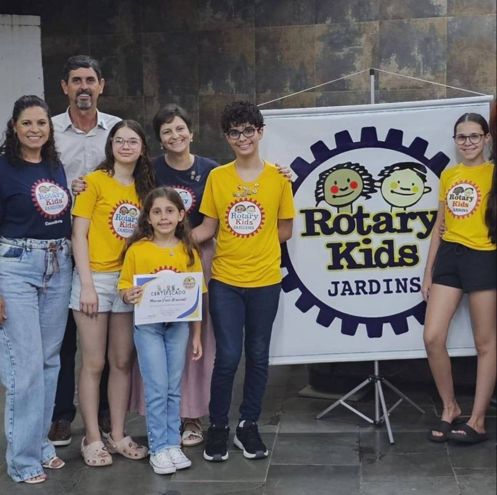 A imagem é interessante e relevante, pois retrata uma cerimônia de reconhecimento ou premiação do programa Rotary Kids, que provavelmente é uma iniciativa comunitária ou educacional. A presença do certificado e do banner indica um evento organizado para celebrar as conquistas dos participantes.