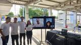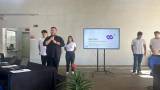 A imagem mostra um grupo de sete pessoas posando para uma foto em um ambiente interno que parece ser uma sala ou galpão com estrutura metálica no teto. As pessoas estão sentadas e em pé, formando uma linha. Da esquerda para a direita, há um homem de camisa preta em pé, seguido por uma mulher de calça rosa e camiseta branca com os logotipos "CPS" e "Etec", três jovens sentados de camiseta branca, um jovem de camiseta preta e um homem de barba grisalha, também em pé, usando uma camisa preta com os mesmos logotipos "CPS" e "Etec". Todos estão sorrindo ou com expressões neutras, e o ambiente é bem iluminado com luz natural entrando pelas janelas ao fundo.