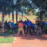 A imagem mostra um grupo de cerca de 18 pessoas posando para uma foto ao ar livre em um dia ensolarado. A maioria das pessoas está vestindo roupas esportivas, predominantemente na cor azul. Algumas pessoas estão segurando balões azuis. O grupo está em frente a uma estrutura de pedra alta, que parece ser um monumento ou uma escultura. Ao fundo, é possível ver um gramado verde e alguns prédios altos. Há também uma caixa térmica azul e branca no canto inferior direito da imagem. Todos parecem estar sorrindo e o ambiente é descontraído.