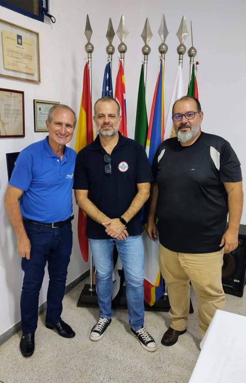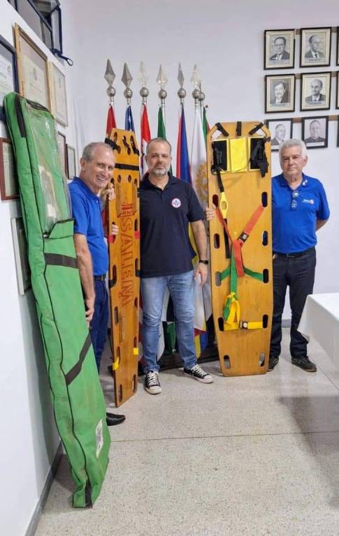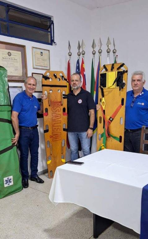 A imagem mostra três homens posando para uma foto em uma sala. Eles estão segurando pranchas de resgate, que são usadas para imobilizar e transportar pessoas feridas. O homem à esquerda está vestindo uma camisa polo azul e calça escura. Ele segura uma prancha laranja com a palavra "SALEM" escrita em letras grandes e vermelhas. O homem no centro está vestindo uma camisa polo preta e calça jeans. Ele também segura a mesma prancha laranja. O homem à direita está vestindo uma camisa polo azul e calça escura, e segura uma prancha amarela com tiras coloridas de segurança. Ao fundo, há várias bandeiras em um suporte, incluindo bandeiras do Brasil e de outros países. Na parede, há quadros com certificados e diplomas. No canto inferior direito da imagem, há uma mesa coberta com uma toalha branca, sobre a qual está um celular.