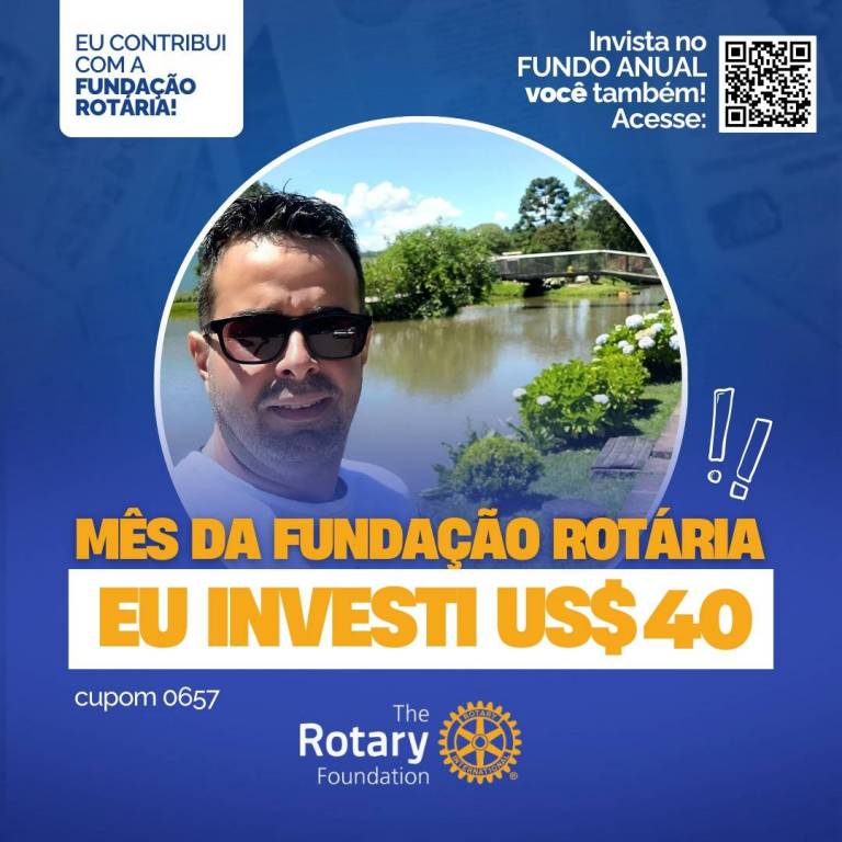 A imagem é um anúncio da Fundação Rotária. No centro, há uma foto de um homem jovem de camiseta branca e óculos de sol em um lugar aberto e próximo a um lago. Acima da foto, no canto superior esquerdo, está escrito "EU CONTRIBUI COM A FUNDAÇÃO ROTÁRIA!" em letras maiúsculas e em azul. No canto superior direito, há um texto em branco que diz "Invista no FUNDO ANUAL você também! Acesse:" seguido de um código QR. Abaixo da foto, em uma faixa azul, está escrito em letras grandes e amarelas "MÊS DA FUNDAÇÃO ROTÁRIA" e logo abaixo, em letras ainda maiores, "EU INVESTI US$ 40". No canto inferior esquerdo, em letras pequenas e brancas, está escrito "cupom 0657”. Abaixo centralizado está o símbolo do The Rotary Foundation com a roda rotária ao lado em amarelo.