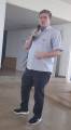 1. Um homem de cabelos grisalhos, vestindo uma camisa de manga longa preta e calça clara. Ele está sorrindo e tem a mão direita no bolso.
