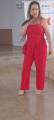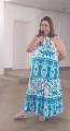 2. Uma mulher de cabelos longos e escuros, usando um vestido azul claro com alças finas. O vestido tem um detalhe em forma de flor em relevo na altura do peito. Ela está sorrindo e tem a mão esquerda no ombro da mulher ao seu lado.