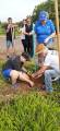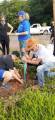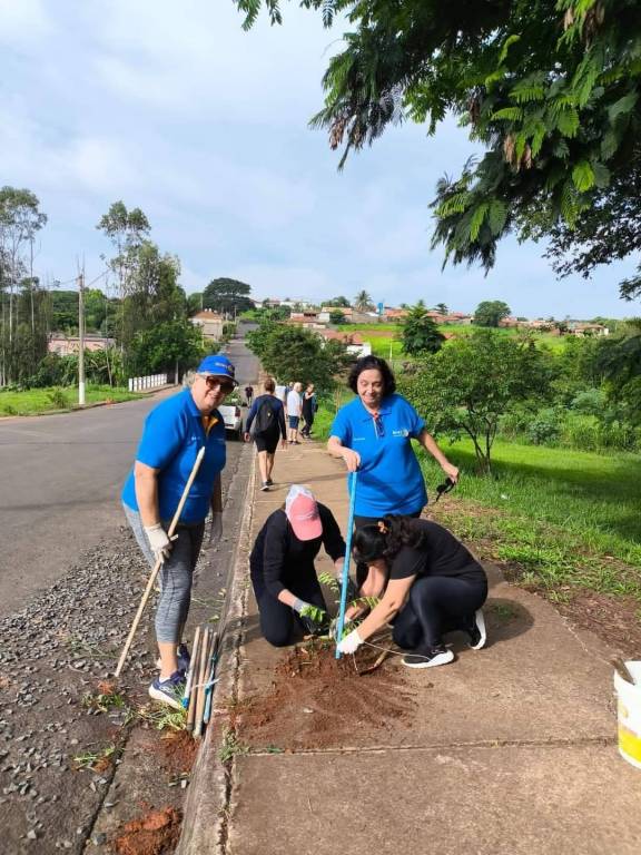 3. No canto inferior direito, duas mulheres estão plantando uma muda. Uma delas está usando uma camiseta azul do Rotary.