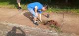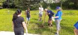 Abaixo, há uma grande foto central mostrando um grupo de 12 pessoas em um gramado verde, algumas segurando ferramentas de jardinagem, como pás e enxadas. Eles estão sorrindo e posando para a foto, com árvores ao fundo.