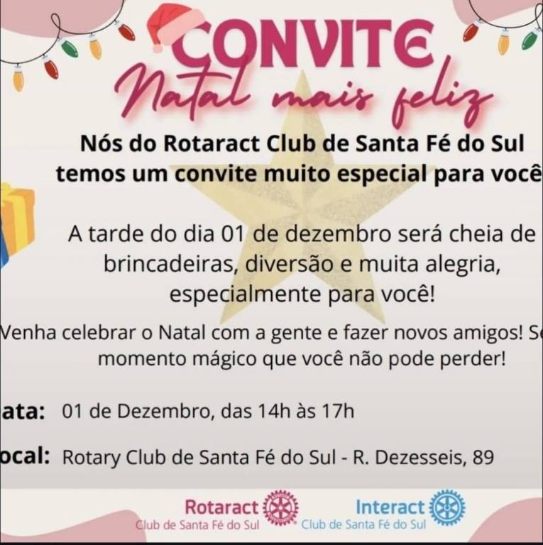 Na parte inferior da imagem, há os logotipos do Rotaract Club de Santa Fé do Sul, em rosa, e do Interact Club de Santa Fé do Sul, em azul. Há também uma estrela amarela grande ao fundo do texto, e um presente colorido no canto esquerdo inferior.