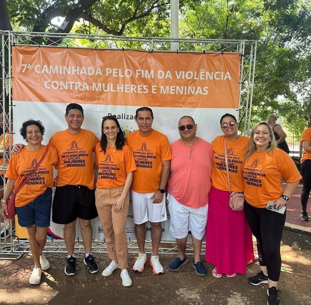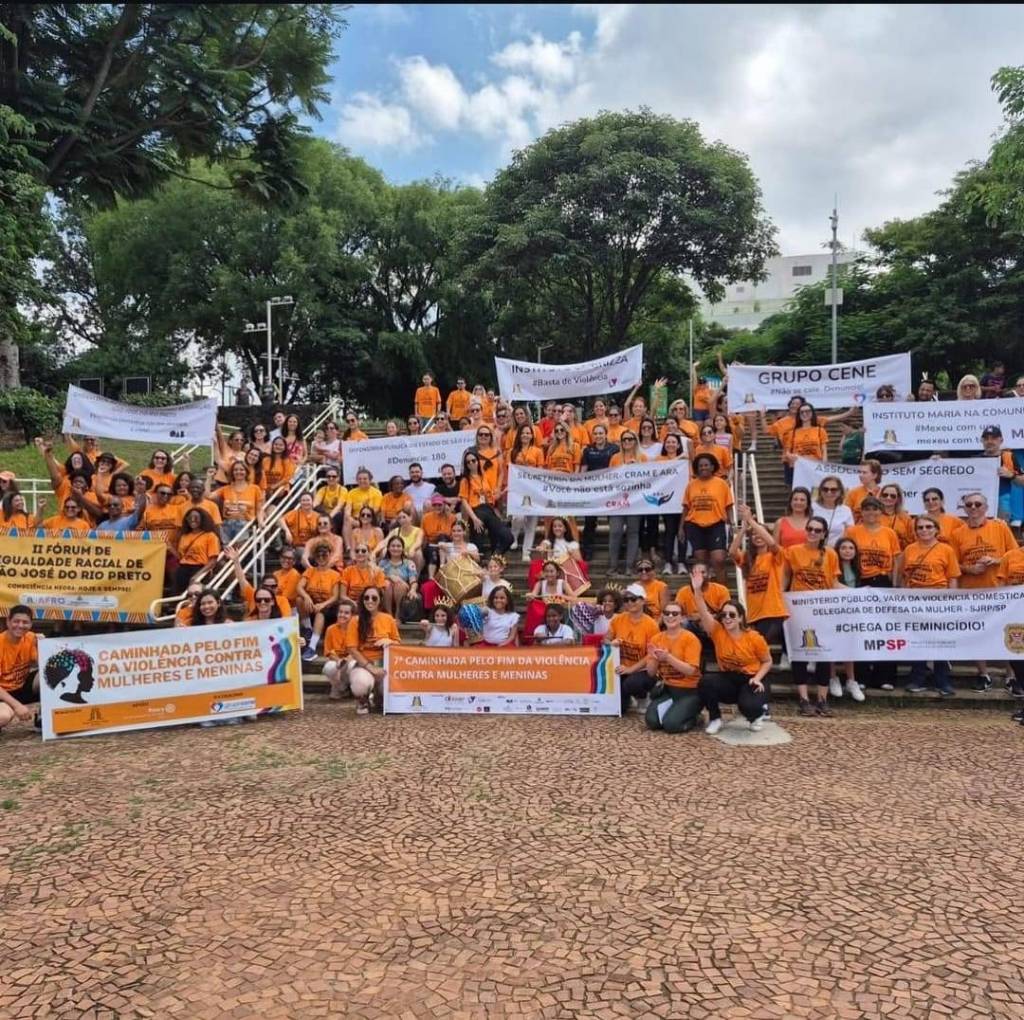 A imagem mostra um grupo de oito pessoas posando para uma foto em frente a um banner. Sete delas estão vestindo camisetas laranja com a inscrição "Caminhada pelo fim da violência contra mulheres e meninas". Uma pessoa está vestindo uma camiseta rosa. O banner ao fundo tem a mesma mensagem, "7ª Caminhada pelo fim da violência contra mulheres e meninas", escrita em branco sobre um fundo laranja. Na frente do grupo, há uma faixa segurada por duas pessoas, que também diz "Caminhada pelo fim da violência contra mulheres e meninas" com o desenho de um perfil de uma mulher com cabelo colorido. A faixa menciona "Realização", "Apoio Rotary Club de São José do Rio Preto" e "Patrocínio Grupocene". O ambiente parece ser ao ar livre, com árvores ao fundo.