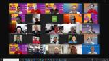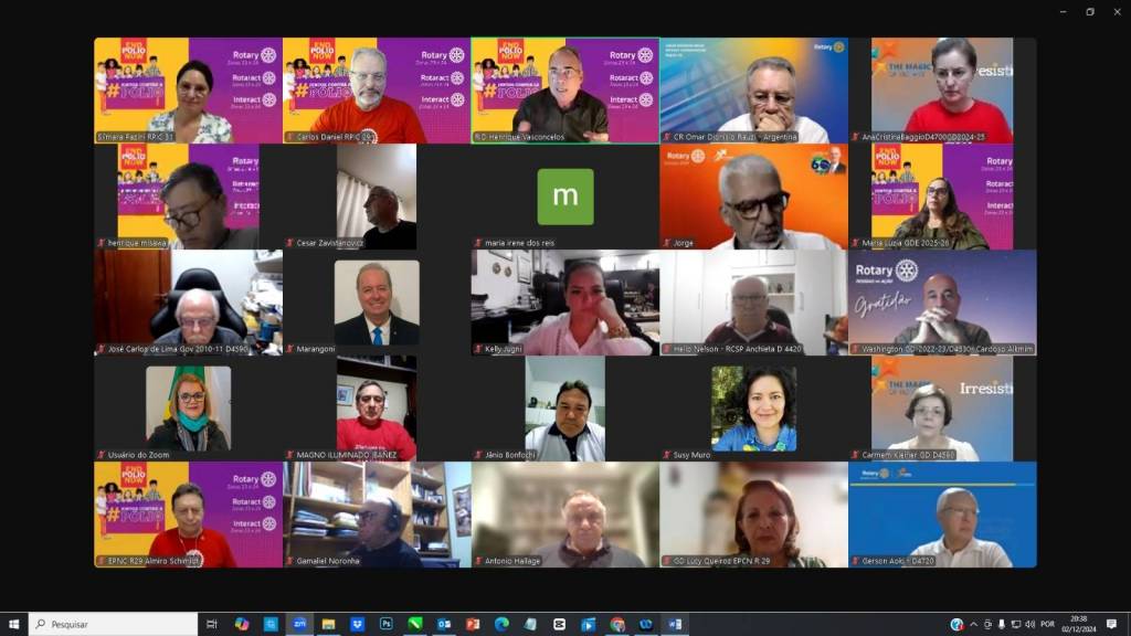 A imagem é uma captura de tela de uma reunião virtual com várias pessoas em suas janelas de vídeo, provavelmente usando uma plataforma de videoconferência. Cada participante está em um ambiente interno, e muitos têm fundos personalizados com cores vibrantes e logotipos do Rotary. Alguns fundos destacam a campanha "End Polio Now", sugerindo que a reunião pode estar relacionada a essa iniciativa.