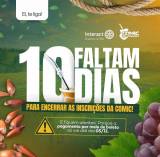 A imagem é um anúncio colorido com um fundo que parece ser uma paisagem rural, com folhas verdes e um campo ao fundo. No canto superior esquerdo, há um texto em um balão branco que diz "Ei, te liga!". No centro, em letras grandes e brancas, está escrito "10 FALTAM DIAS", com a palavra "FALTAM" em verde e "DIAS" em branco. Abaixo, em letras amarelas sobre um fundo verde, está escrito "PARA ENCERRAR AS INSCRIÇÕES DA COMIC!". No canto superior direito, há dois logotipos: o do Interact Distrito 4700 e o da Comic das Tradições. No canto inferior direito, há uma imagem de uma cuia de chimarrão e, ao lado, um cacho de uvas. No canto inferior esquerdo, há pinhões. Na parte inferior, há um aviso em um retângulo verde com um triângulo de alerta amarelo, dizendo: "E fiquem atentos! Porque o pagamento por meio de boleto só vai até dia 05/12."