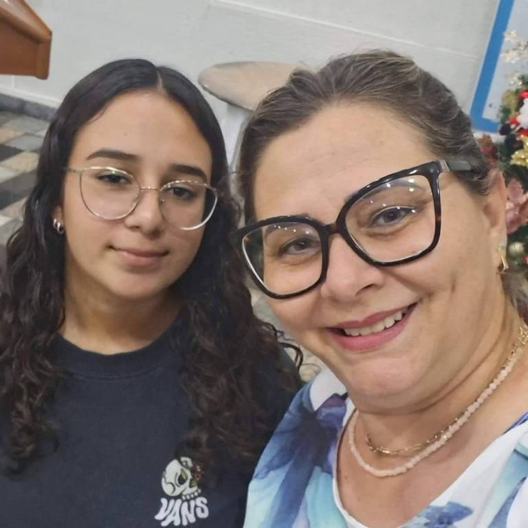 A imagem mostra quatro mulheres posando para uma foto em um ambiente interno. A mulher na frente está tirando a selfie e usa óculos de armação preta, tem cabelo castanho claro e está sorrindo. Atrás dela, à esquerda, há uma mulher de cabelo escuro e cacheado, também usando óculos. No centro, outra mulher com cabelo liso e castanho claro, usando uma camiseta azul com a palavra "Interact" parcialmente visível. À direita, uma mulher de cabelo liso e castanho claro, usando uma camiseta azul com detalhes em laranja e uma estampa que inclui um coqueiro e o sol. Ao fundo, há uma decoração de Natal com flores e enfeites.