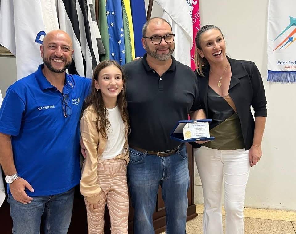 A imagem captura um momento de celebração e reconhecimento em um evento do Rotary Club de Jaú Centro. Quatro pessoas estão posando juntas, sorrindo para a foto. Da esquerda para a direita, vemos um homem careca com barba, vestindo uma camisa polo azul com o nome "Alê Resende" bordado, indicando sua possível afiliação ao Rotary. Ao lado dele, uma jovem menina com cabelos longos e castanhos, vestindo uma jaqueta e calça bege com estampa de zebra e uma camiseta branca, está sorrindo alegremente. No centro, um homem de óculos, com barba e cabelo curto, veste uma camisa polo preta e jeans. Ele segura uma placa de homenagem, simbolizando o reconhecimento por seu destaque profissional na sociedade civil. À direita, uma mulher com cabelo castanho preso, usando um blazer preto, blusa preta e calça branca, também sorri. Ao fundo, várias bandeiras estão expostas, incluindo uma do Rotary Club e outra com o nome "Eder Pedrassani", sugerindo um contexto formal e de prestígio. Este evento parece ser uma cerimônia de reconhecimento, onde o Rotary Club de Jaú Centro homenageia profissionais que se destacaram em suas áreas de atuação.
