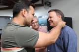Em primeiro plano dois homens de perfil sorrindo e o que está na esquerda provavelmente coloca um distintivo rotário no colarinho da camisa do que está na direita.