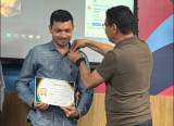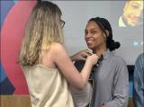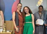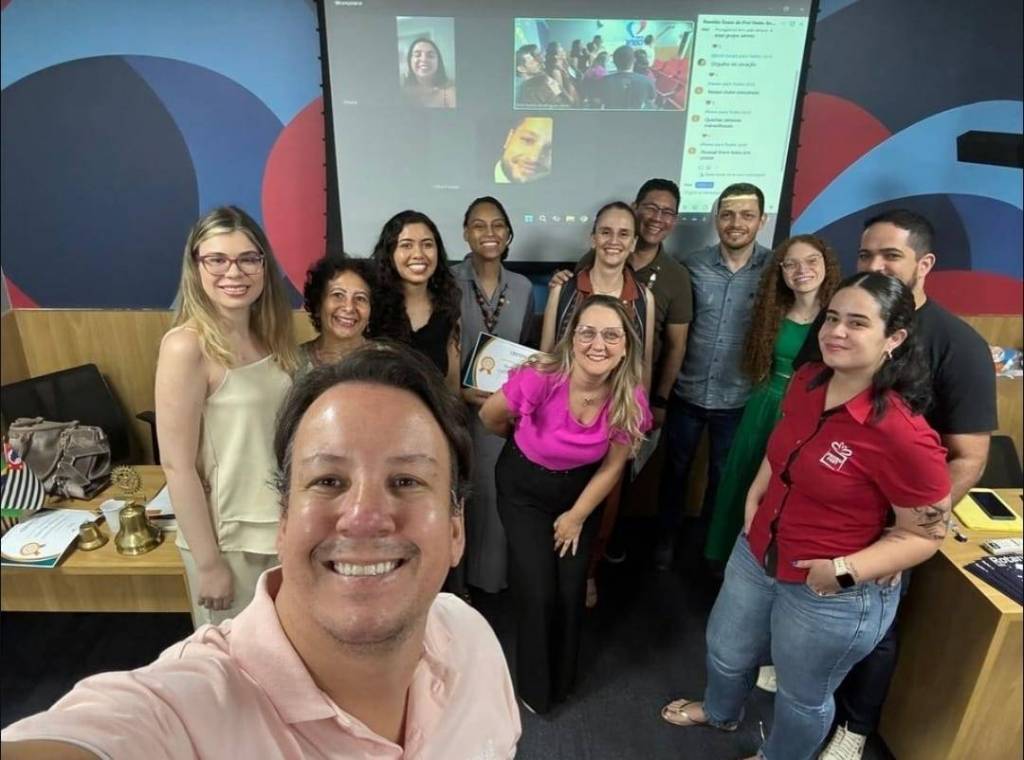 A imagem mostra um grupo de pessoas em pé na frente de uma tela que exibe uma chamada de vídeo. Os indivíduos estão segurando certificados, indicando que receberam algum tipo de reconhecimento ou prêmio. O ambiente parece ser um evento formal, possivelmente uma formatura ou uma cerimônia de premiação. O fundo inclui um design colorido na parede e um sino em um pódio de madeira, sugerindo uma ocasião comemorativa ou oficial. Os certificados nas mãos dos indivíduos têm a palavra "CERTIFICADO" escrita neles. A chamada de vídeo na tela mostra participantes adicionais que estão participando do evento remotamente.