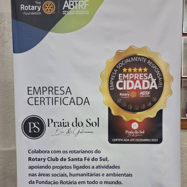 A imagem mostra um banner de certificação da The Rotary Foundation e da ABTRF (Associação Brasileira da The Rotary Foundation). O banner certifica o "Praia do Sol Bar & Gastronomia" como uma empresa socialmente responsável e uma "Empresa Cidadã". A certificação é válida até dezembro de 2025. O banner também menciona que o Praia do Sol colabora com o Rotary Club de Santa Fé do Sul, apoiando projetos relacionados a atividades sociais, humanitárias e ambientais da Fundação Rotária em todo o mundo.