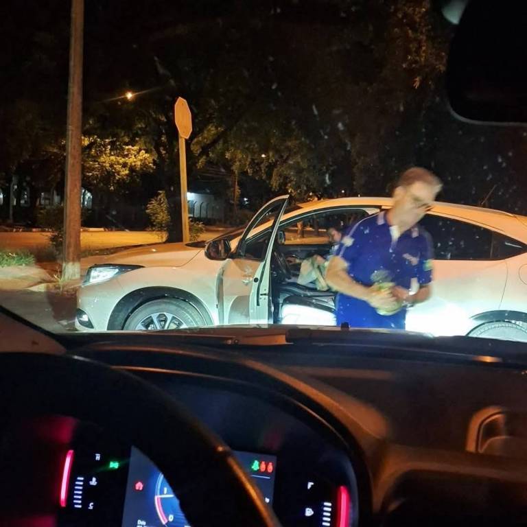 A imagem mostra duas pessoas de pé lado a lado. A pessoa à esquerda está segurando um sino grande de bronze, com o emblema do Rotary International no topo. A pessoa à esquerda está vestindo uma camiseta polo azul com o logo do Rotary International e um patch da bandeira do Brasil na manga. A pessoa à direita está vestindo uma camisa clara com vários broches. O fundo parece ser um ambiente externo à noite, com alguns prédios e postes de luz visíveis. Esta imagem é interessante e relevante, pois retrata membros da organização Rotary International, reconhecida por seus esforços de serviço comunitário e humanitário.