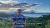 A imagem mostra um homem com poucos cabelos grisalhos, barba e bigode grisalhos, usando uma camiseta gola polo com listras horizontais largas e alternadas em azul claro e azul escuro. Há uma legenda escrito em amarelo: as cinco avenidas de serviço do Rotary. No fundo a imagem de montanhas, prédios, o mar, e mais próximo várias tonalidades de verde que mostram muitas árvores e arbustos. O céu está azul com algumas nuvens claras e escuras.