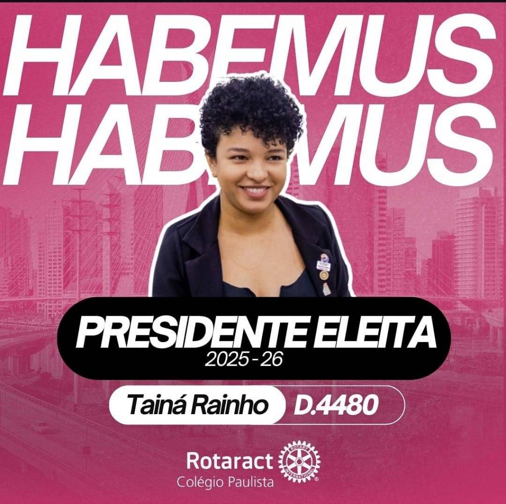 Abaixo de sua imagem temos um retângulo fundo preto escrito em letras brancas: Presidente Eleita 2025-26. Abaixo em fundo branco com letras pretas: Tainá Rainho D.4480. Finalizando o card abaixo centralizado o símbolo em branco do Rotaract Colégio Paulista.