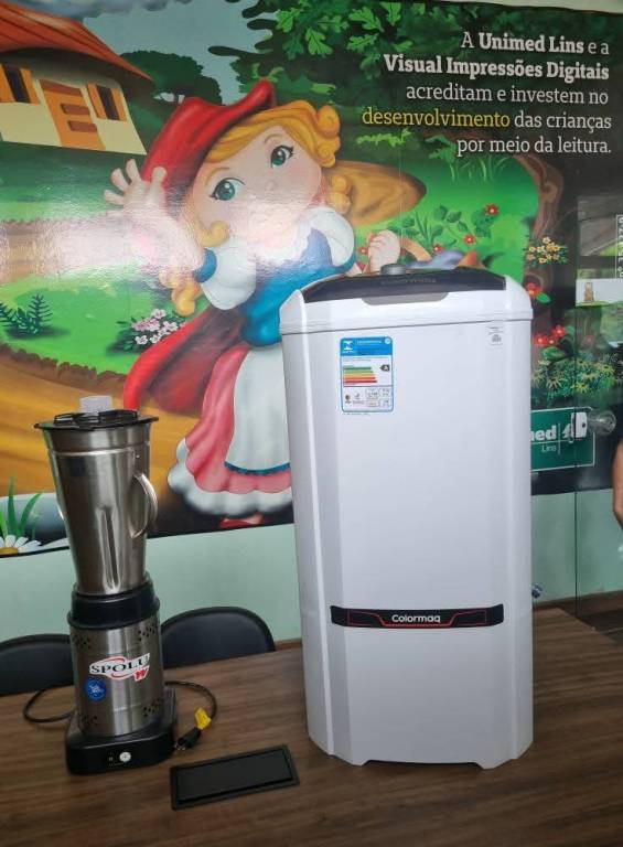 Na mesa à frente das pessoas, há um liquidificador industrial da marca Spolu, de cor metálica com base preta, e uma máquina de lavar branca da marca Colormaq. A máquina de lavar tem um adesivo com informações técnicas na parte superior. A mesa é de madeira escura.