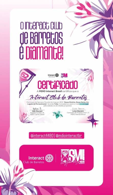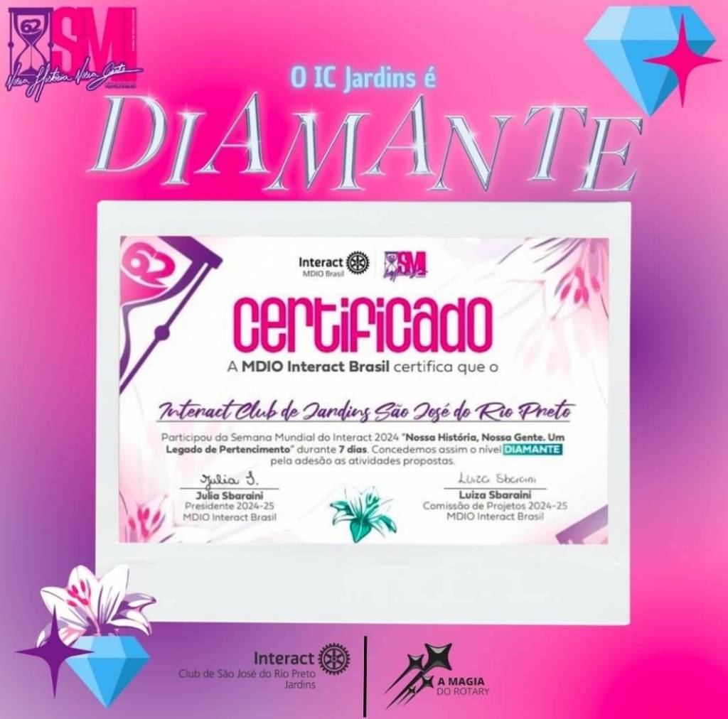 Interact Club de São José do Rio Preto - Jardins e do Interact Club de Barretos é nível diamante na SMI do Interact Br