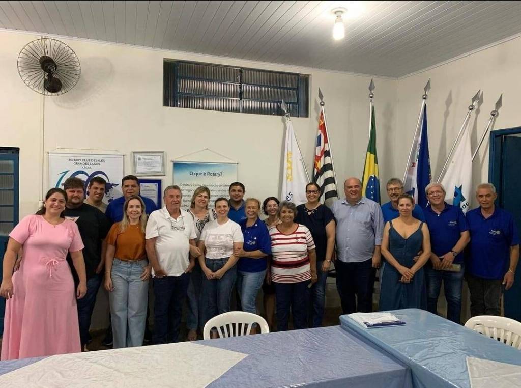 Na parede atrás do grupo, há várias bandeiras, incluindo a do Brasil e de São Paulo. Há também dois cartazes: um com o título "O que é Rotary?" e outro com o nome "Rotary Club de Jales Grandes Lagos". No teto, há uma luminária acesa e um ventilador de parede. Na frente do grupo, há mesas cobertas com toalhas azuis e brancas.