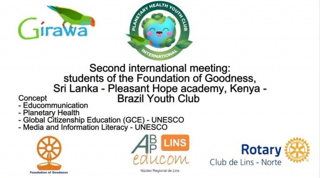 No topo, há o logotipo do Girawa, que é um papagaio colorido, e o logotipo do Planetary Health Youth Club International, que mostra um planeta sorridente com folhas ao redor. Na parte inferior, há logotipos da Foundation of Goodness, ABP Lins Educom Núcleo Regional de Lins, e Rotary Club de Lins - Norte.