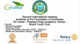 A imagem é um cartaz anunciando o "Second international meeting" (Segundo encontro internacional) entre estudantes da Foundation of Goodness, Sri Lanka, Pleasant Hope Academy, Quênia, e Brazil Youth Club. O conceito do encontro inclui: