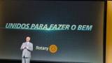 Ao fundo, uma grande tela exibe o lema "UNIDOS PARA FAZER O BEM" em letras maiúsculas e de cor azul clara, que se destaca contra um fundo escuro com um padrão de pontos azuis. Este lema representa o foco do Rotary em promover a união e a colaboração para realizar ações benéficas. Abaixo do lema, à direita, está o logotipo do Rotary, com uma roda dentada amarela ao lado da palavra "Rotary" em letras brancas.