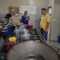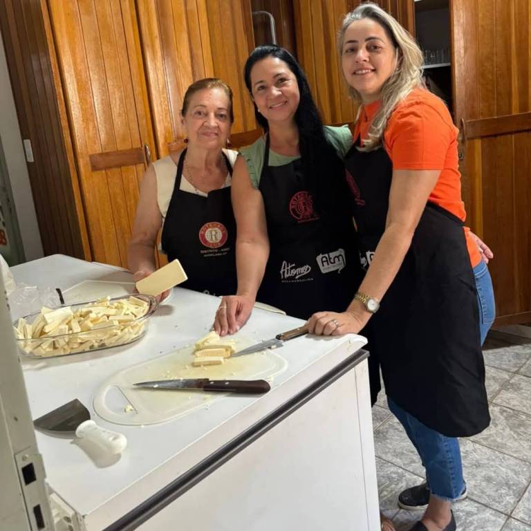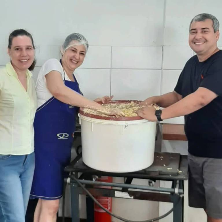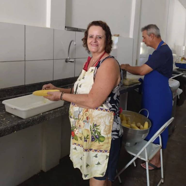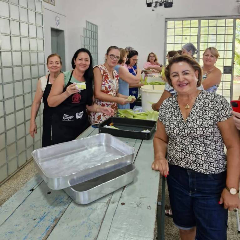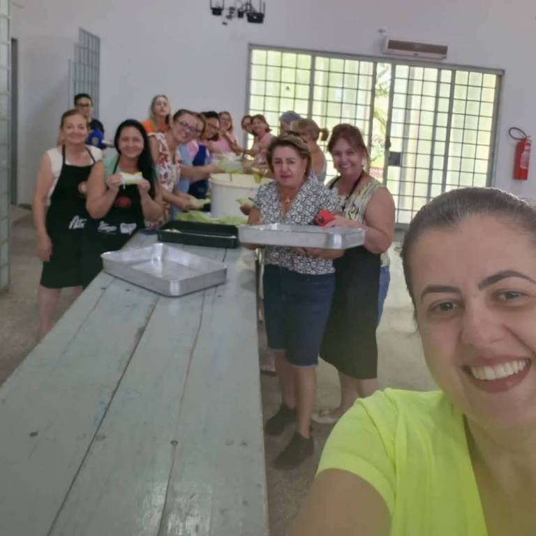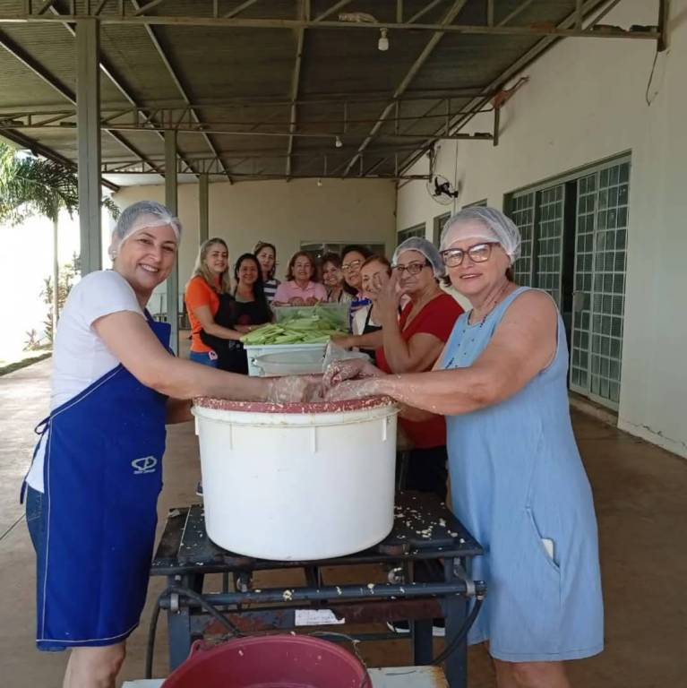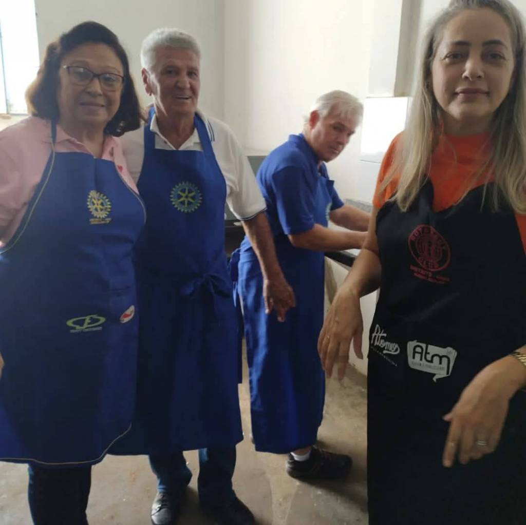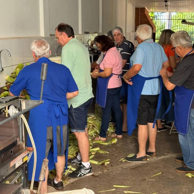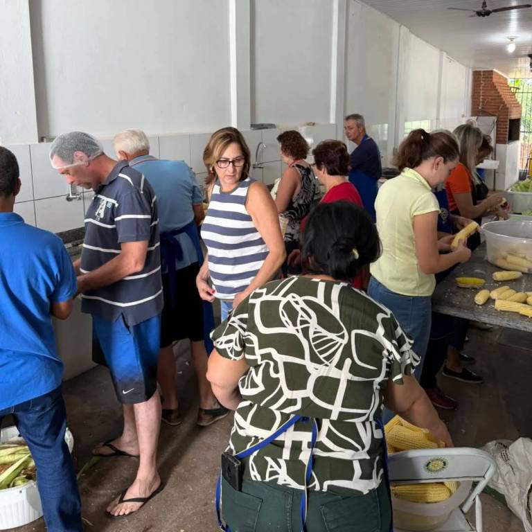 A cena reflete um esforço comunitário e solidário, com os membros do Rotary Club de Auriflama trabalhando juntos na preparação de pamonhas, possivelmente para um evento beneficente ou distribuição para a comunidade.