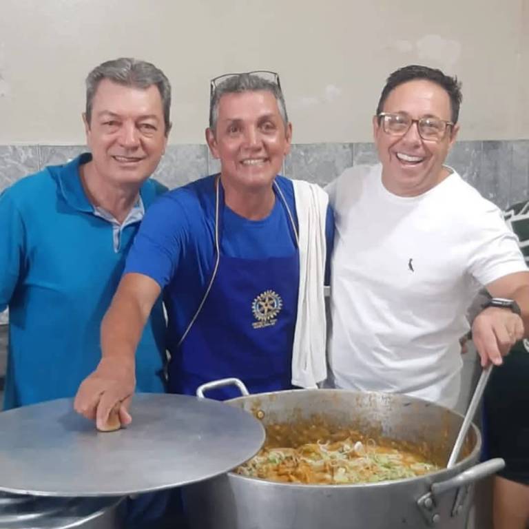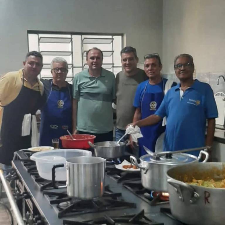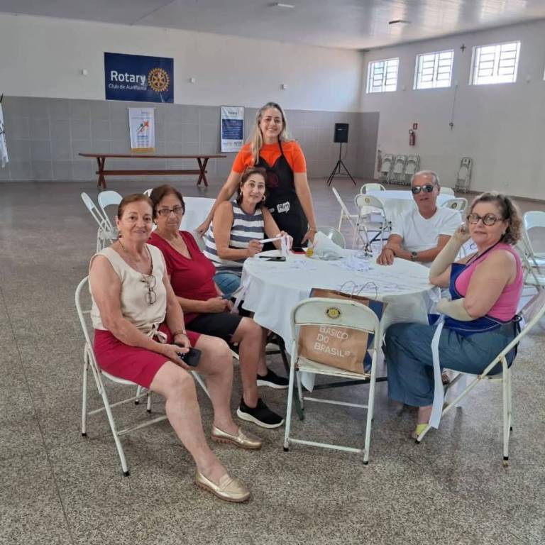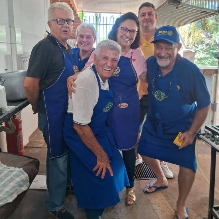 Atrás deles, mais quatro pessoas participam da atividade. Um homem de camiseta azul escura e calça jeans, um senhor de óculos com uma camisa preta, uma mulher de óculos com uma camisa rosa e calça jeans, e outro senhor de cabelos brancos com uma camisa branca do Rotary. Todos estão sorrindo, transmitindo um clima de camaradagem e cooperação.