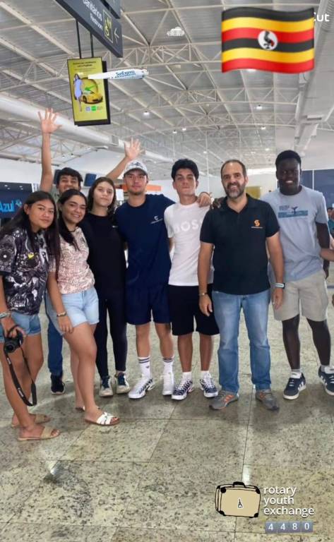 A imagem mostra um grupo de sete pessoas em pé juntas, aparentemente em um aeroporto. As pessoas têm seus rostos desfocados. Algumas delas estão com os braços em volta umas das outras, e duas pessoas têm os braços levantados. Uma pessoa está segurando uma câmera. Acima do grupo, há uma placa com o texto "Sanitários" e uma seta apontando para a esquerda. Também há um anúncio com uma pessoa e um carro, com o texto "SunExpress" e a imagem de um avião. No canto superior direito, há uma bandeira de Uganda. No canto inferior direito, há um logotipo com o texto "rotary youth exchange" e o número "4480".