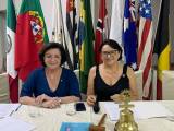 Foto de duas mulheres com sorrisos discretos nos lábios, sentadas e apoiadas em uma mesa com toalha clara e vários objetos sobre elas, entre eles um sino rotário e seu martelo, várias folhas de papel escritas, dois copos de vidro, um celular e um microfone. Atrás delas um grande pavilhão com suas bandeiras. As cadeiras que acompanha a mesa estão com encosto de tecido bege.