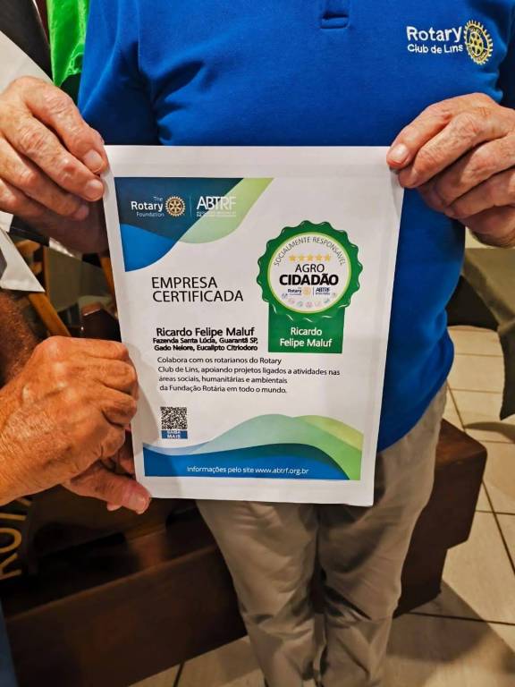 Durante a reunião do Rotary Club de Lins, o Pres. Israel Alfonso prestou homenagem ao companheiro Gov. Ricardo Maluf, por ter renovado a doação de mil dólares rotários à Fundação Rotária, fazendo da sua empresa, Fazenda Santa Lúcia, uma empresa Agro Cidadã, concretizando um dos objetivos do Clube neste ano rotário. O companheiro Maluf convidou os companheiros a fazerem um esforço para que outras empresas sigam o seu exemplo e ajudem os projetos sociais do Rotary, através da ABTRF.