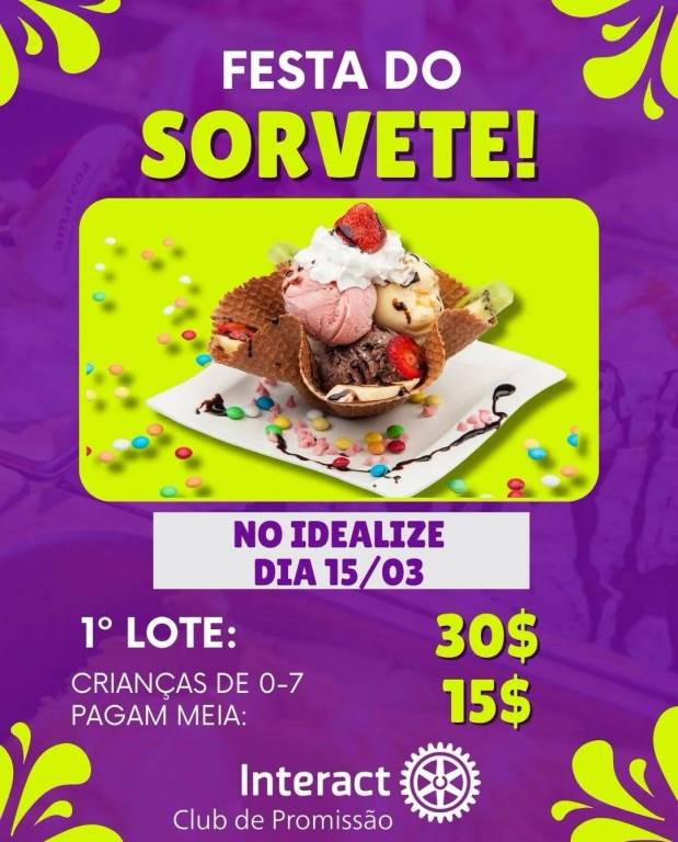O Interact Club de Promissão, no dia 15 de março, realizará a "festa do sorvete", no qual será distribuído sorvete à vontade entre às 15 e 18 horas no Colégio Idealize.
