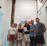 Foto tirada de baixo para cima trás seis pessoas, sendo três mulheres e três jovens rapazes. As mulheres estão posicionadas na esquerda e os homens na direita. O rapaz que está no centro segura nas mãos uma flâmula. Todos estão sorridentes e vestidos de maneira bem esporte. O local é fechado, tem paredes claras, ao fundo observamos um pilar de madeira e ao lado um banner rotário, na direita uma janela com cortinas de painéis brancos e na esquerda o que parece ser uma porta com uma luz esverdeada que vem de fora.