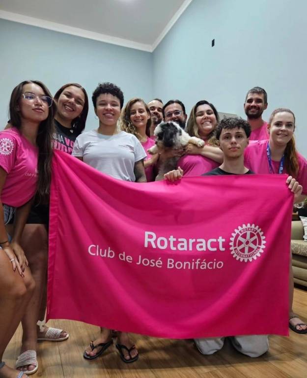 Eles seguram à frente uma grande bandeira pink do Rotaract Club de José Bonifácio.