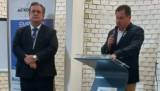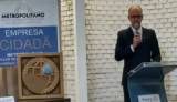 Na lateral esquerda parte de uma bandeira branca e preta e na lateral direita um homem vestindo terno escuro está atrás de uma tribuna de metal e atrás dele um banner de Empresa Cidadã. O lugar está iluminado.