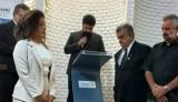 Foto tirada da lateral esquerda de uma mesa retangular grande de madeira escura acompanhada de cadeiras também de madeira, onde três casais estão posicionados de pé atrás da mesma olhando para frente. Eles estão vestidos de maneira clássica: homens de terno escuro e as mulheres elegantemente vestidas. Sobre a mesa garrafinhas d’água, papéis brancos, bolsas femininas, etc. À frente da mesa em um degrau duas caixas de som escuras. Ao fundo bem como em todo espaço paredes de tijolinhos claros.