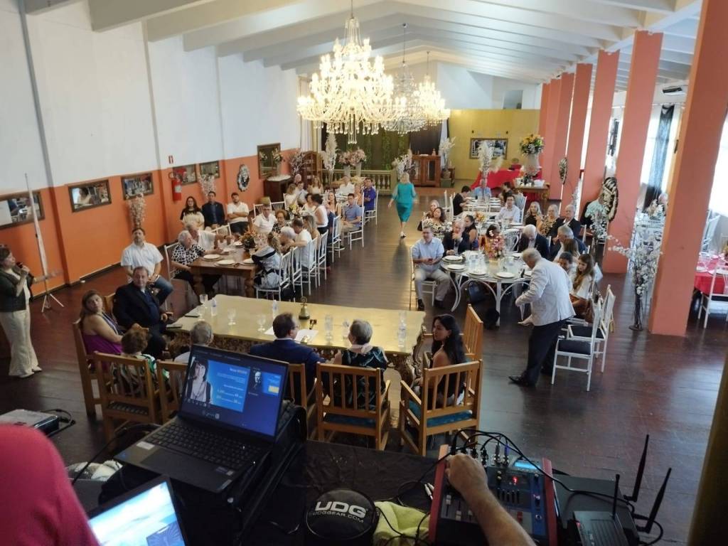 O evento ocorre em um ambiente formal, possivelmente na Casa de Portugal em São José do Rio Preto, promovido pelo Distrito 4480 em comemoração aos 120 anos do Rotary Internacional. A mesa onde as sete pessoas estão sentadas é grande e ornamentada, com detalhes dourados, sugerindo um ambiente de prestígio. As pessoas estão vestidas de maneira formal, o que é típico em eventos comemorativos e homenagens. A presença de uma campainha sobre a mesa pode indicar que é usada para chamar a atenção ou marcar o início de discursos. A projeção na parede ao fundo, mostrando um vídeo do YouTube, pode estar relacionada ao tema do evento ou à homenagem ao companheiro Governador João Batista Queiroz. A decoração do local, com elementos dourados e uma máscara decorativa, adiciona um toque de sofisticação ao ambiente.