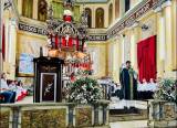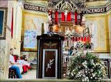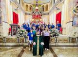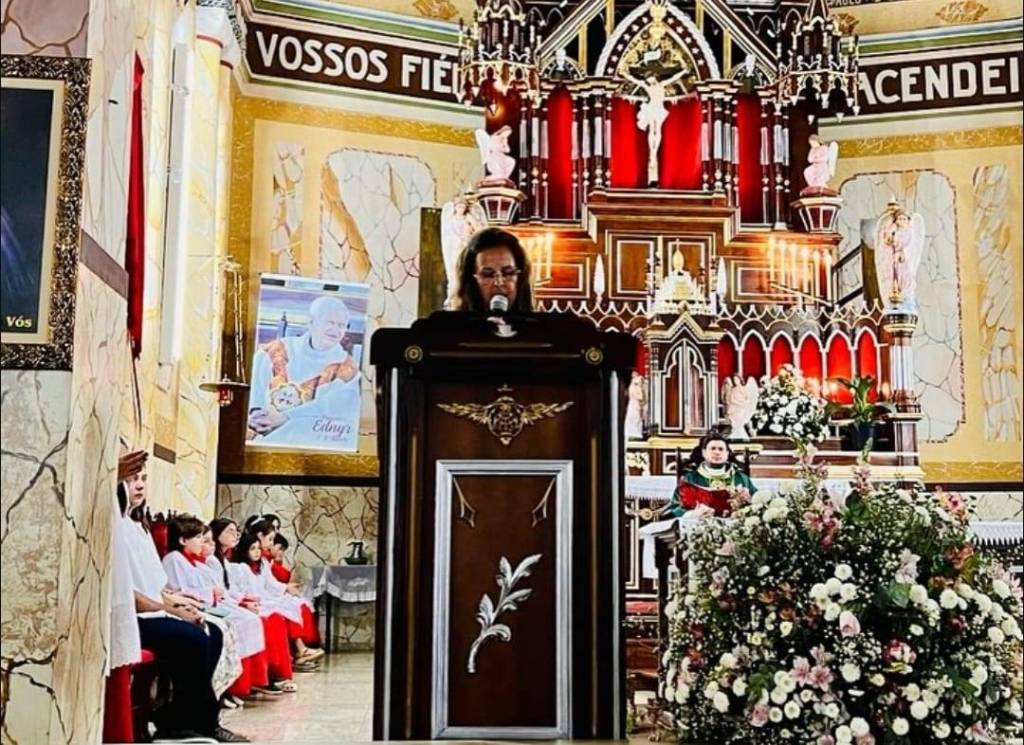 A imagem parece capturar um momento de celebração dentro de uma igreja, possivelmente relacionada aos 120 anos do Rotary Internacional em Itápolis. O grupo de pessoas, incluindo crianças e adultos, está reunido em frente ao altar, sugerindo uma ocasião especial. As camisetas azuis que muitos estão vestindo podem indicar uma participação ou associação com o Rotary. A decoração da igreja, com flores e velas, junto com a presença do padre, reforça a ideia de uma missa ou cerimônia comemorativa. A atmosfera é de alegria e união, típica de eventos comemorativos importantes.