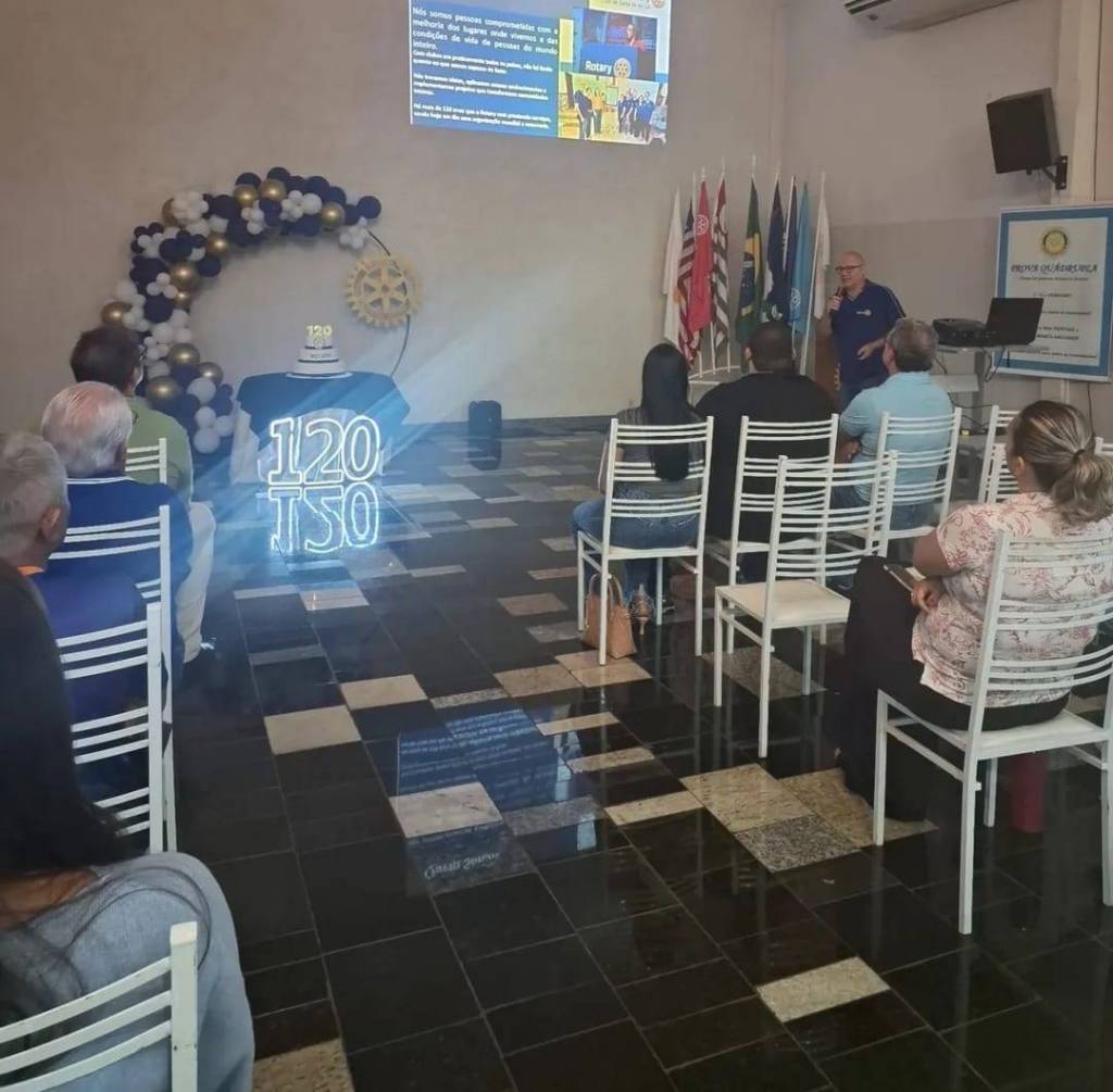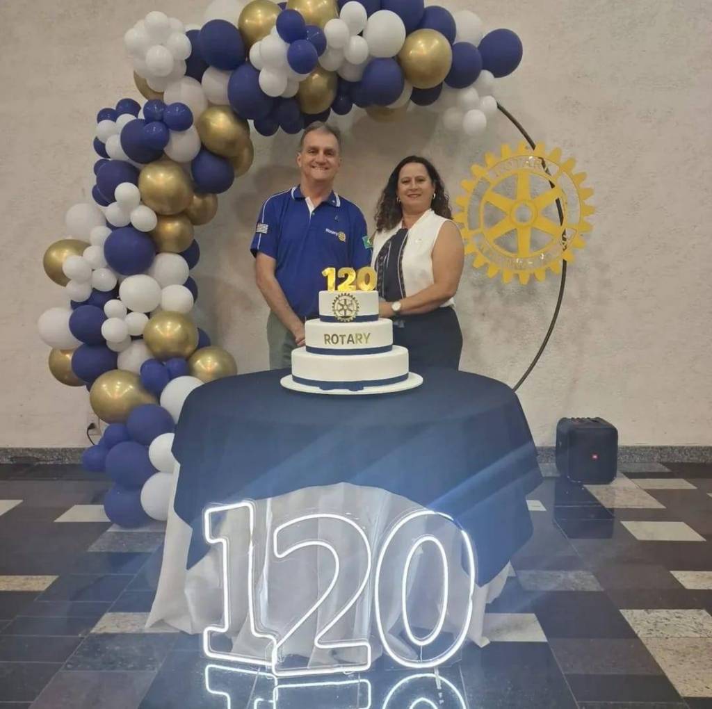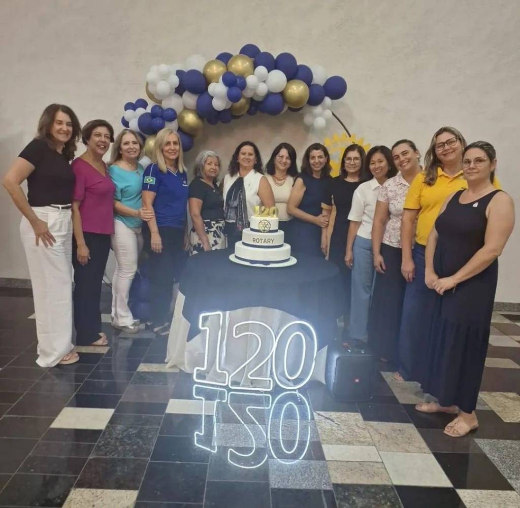Um grupo grande de pessoas está posando para uma foto em um salão. No centro, há uma mesa com um bolo decorado e um arranjo de balões nas cores azul, branco e dourado. Na frente da mesa, há uma placa iluminada com os números "120". As pessoas estão sorrindo e algumas estão usando camisetas azuis com o logotipo do Rotary. O piso é de azulejos em tons de preto, cinza e bege. Ao fundo, há um banner com o logotipo do Rotary.