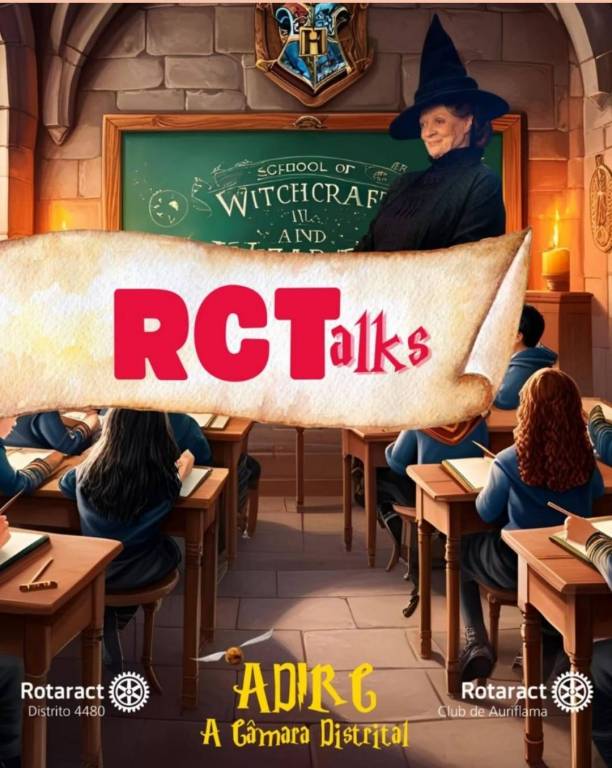 A imagem é uma montagem que combina elementos do universo de Harry Potter com referências ao Rotaract. A sala de aula tem paredes de pedra e está iluminada por velas. Os alunos estão de costas, concentrados em suas anotações. O quadro negro tem desenhos e inscrições que remetem à magia. O brasão de Hogwarts, com a letra "H", está centralizado acima do quadro. A figura que lembra a Professora McGonagall está à direita, vestida de preto e sorrindo levemente. O pergaminho na frente tem um estilo antigo, com as letras "RCTalks" em vermelho e rosa. No chão, há um pequeno objeto dourado com asas, semelhante a um pomo de ouro. As inscrições do Rotaract e "ADIRC A Câmara Distrital" estão em branco e amarelo, respectivamente, com uma fonte que lembra a usada nos filmes de Harry Potter.
