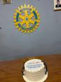 Um grupo de aproximadamente 25 pessoas está reunido em uma sala. Eles estão posando para uma foto em frente a uma parede azul clara, onde há um emblema do Rotary Club. Na parede, também há várias fotos de pessoas emolduradas. Algumas pessoas estão sentadas em cadeiras ao redor de mesas de madeira, enquanto outras estão em pé atrás delas. No centro da mesa principal, há um bolo branco. As pessoas estão sorrindo e parecem estar em um ambiente de confraternização. A maioria está vestida de maneira casual, com algumas pessoas usando camisetas azuis com o logotipo do Rotary Club.