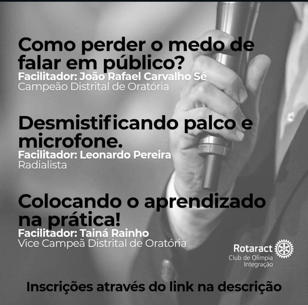 Como perder o medo de falar em público ? Na lateral esquerda temos a imagem de um microfone em um pedestal e logo abaixo na esquerda ainda, o símbolo em branco do Rotaract Club de Olímpia Integração e na direita em destaque: curso de Oratória