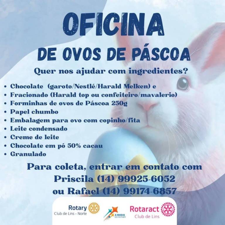 Card quadrado onde observamos ao fundo um padrão em ondas com 2 tonalidades de azul desbotado, ao centro com um tom mais claro e nos cantos superior esquerdo e inferior direiro, um tom mais escuro. No lado esquerdo é possível ver a arte de um coelho cinza, com o fucinho e as patas em branco, Ele segura um ovo de páscoa azul com detalhes em branco e rosa e um laço de fita dourado ao centro. a mensagem contida no card está escrito em azul escuro ocupando toda parte superior e central contendo a seguinte informação: Oficina de Ovos de Páscoa - Em parceria com a ONG Olaria. Na parte inferior está uma área reservada na cor branca, onde é possível identificar em seu interior, do lado esquerdo, o logo do Rotary Club de Lins Norte, com as letras em azul escuro e a Roda Rotária em amarelo. Ao centro está o lema presidencial "A Magina do Rotary", com suas 4 estrelas estilizadas de 4 cores: laranja, azul claro, amarelo e azul escuro e do lado direito, o logo na cor rosa do Rotaract Club de Lins.