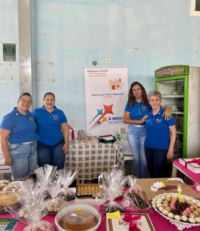 A imagem parece ter sido tirada em um evento organizado pela APAE (Associação de Pais e Amigos dos Excepcionais) e Rotary International, possivelmente um leilão de caridade ou arrecadação de fundos.
