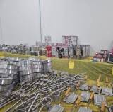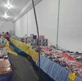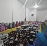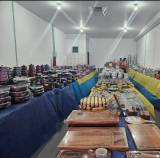 Um grande salão com várias mesas cobertas por toalhas amarelas e azuis. Sobre as mesas, há uma grande quantidade de panelas empilhadas em diferentes cores, como preto, vermelho, azul e rosa. As panelas parecem ser novas, ainda embaladas em plástico. O ambiente é bem iluminado, com paredes brancas e um teto alto. Ao fundo, há uma pequena janela e um extintor de incêndio vermelho fixado na parede.