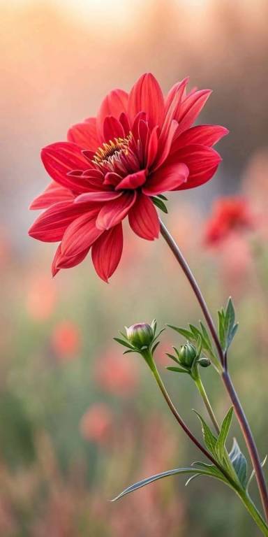 A flor principal é uma dália, com pétalas longas e finas que se sobrepõem, criando um efeito volumoso. As pétalas têm um tom vermelho intenso, com algumas áreas mais escuras próximas ao centro. O caule é fino e verde, sustentando a flor e os dois botões. Os botões são de um verde mais claro, com as pétalas ainda fechadas, mostrando apenas um vislumbre do vermelho que está por vir. As folhas são alongadas e serrilhadas, com um verde vibrante. O fundo desfocado sugere um campo de flores, com manchas de cores que parecem ser outras flores distantes, criando uma sensação de profundidade e serenidade. A luz suave e difusa parece vir de um pôr do sol, adicionando um brilho quente à imagem.